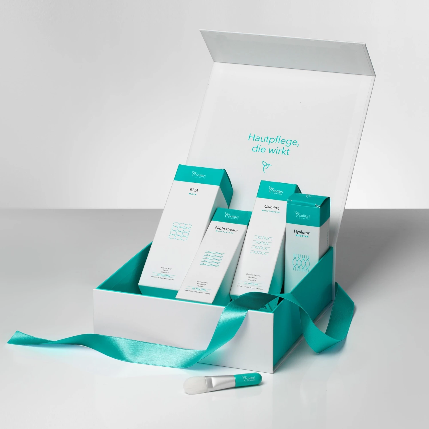Verwöhne Deine Liebsten mit unserer exklusiven colibri Gift Box. Das Geschenkset enthält neben den vier colibri Klassikern auch einen limitierten colibri Maskenpinsel. Das Set, bestehend aus unserem Bestseller Hyaluron Booster, der BHA Mask, dem Calming Moisturizer, und der Night Cream, sorgt für eine strahlende und gepflegte Haut. Auch empfindliche Haut wird damit optimal mit Feuchtigkeit versorgt. Zusätzlich enthalten ist ein veganer Maskenpinsel für hygienisches und präzises Auftragen der Maske sowie für einen kleinen Wohlfühlmoment zu Hause.