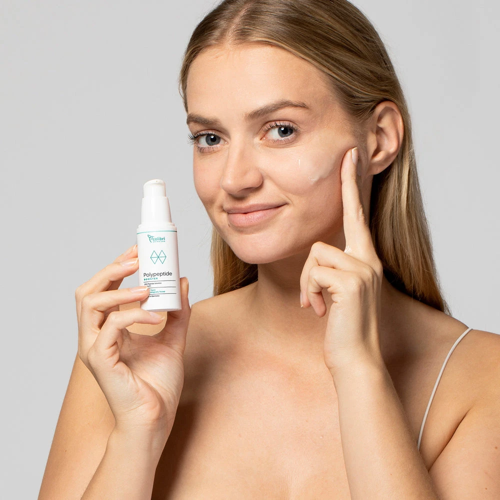 Peptide spielen in der Hautpflege eine wichtige Rolle, insbesondere bei reifer Haut. Diese Verbindungen aus Aminosäuren können aufgrund ihrer geringen Größe leicht von der Haut aufgenommen werden und die Proteinproduktion anregen. Mit zunehmendem Alter verlangsamt sich diese Produktion, was zu Faltenbildung und einem Verlust der Hautfestigkeit führen kann. Unser Polypeptide Booster enthält eine Kombination aus 13 verschiedenen Peptiden, Inulin und Silybin, was verschiedene Vorteile für die Haut bietet. Er fördert effektiv die Kollagensynthese und kann somit Falten und feine Linien glätten. Zusätzlich wird die Hautstruktur und Elastizität verbessert. Die Haut erscheint straffer, praller und ebenmäßiger. Dies macht den Booster zu einem idealen Slow-Aging-Produkt, das ohne Retinoide auskommt und sich daher auch für Schwangere und Stillende eignet.