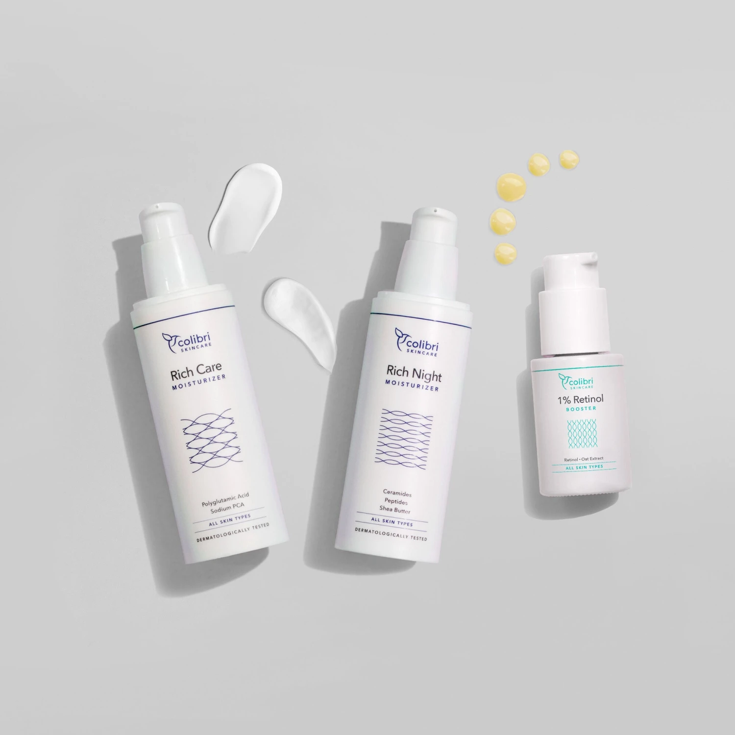 Das Retinol Rich Set beinhaltet Produkte, welche perfekt auf die Anwendung mit Retinol abgestimmt sind. Kaum ein Inhaltsstoff kann so eine drastische Verbesserung des Hautbildes herbeiführen wie Retinol. Allerdings können durch hochkonzentriertes Retinol Nebenwirkungen wie Trockenheit und Rötungen auftreten. Unser Rich Care Moisturizer und Rich Night Moisturizer mit Ceramiden beruhigen die Haut mit Inhaltsstoffen, die die Hautbarriere nähren und reparieren.